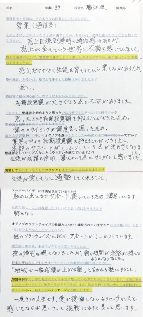 私たちの「想い」と「可能性」を共感して生徒や保護者だけでなく社会に貢献していく想いをもった方と一緒に仕事をしていきたい。単なるビジネスではなく、教育を通した喜びを感じてもらえるようなFC展開を目指しています。子ども・保護者・オーナー様の希望を叶える塾経営を目指しています。